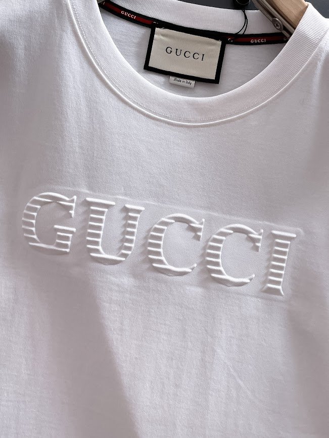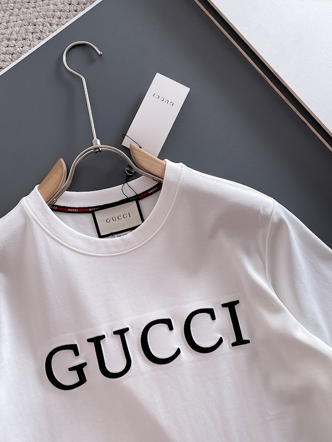 واحدة من أهم عناصر الجذب في هذا التيشيرت هي لوقو GUCCI الموجود على الصدر، والذي يأتي بتصميم واضح وأنيق يعكس هوية العلامة التجارية الفاخرة. هذا اللوقو لا يضيف فقط لمسة جمالية، بل يعبر أيضًا عن الذوق الرفيع والاهتمام بالتفاصيل، مما يجعل التيشيرت أكثر من مجرد قطعة ملابس عادية.