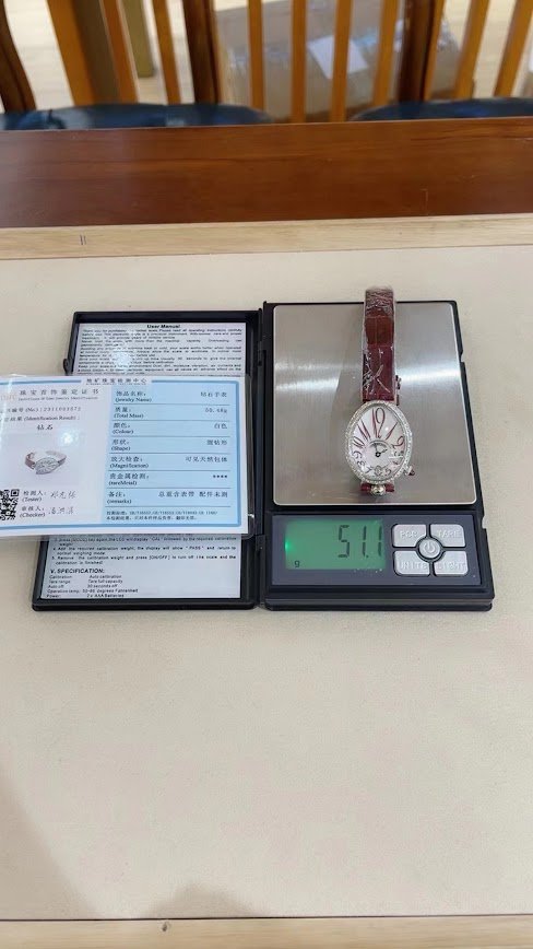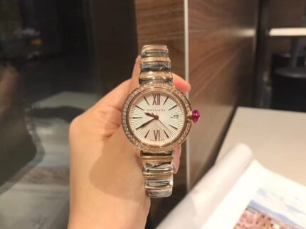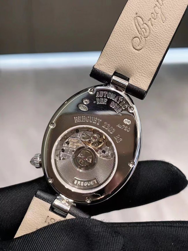 ساعة Breguet نسائية بتصميم أنيق بإطار مرصع بالألماس، وسوار جلد فاخر (عودي أو أسود) مع ماكينة سويسرية دقيقة تعطيك فخامة استثنائية.