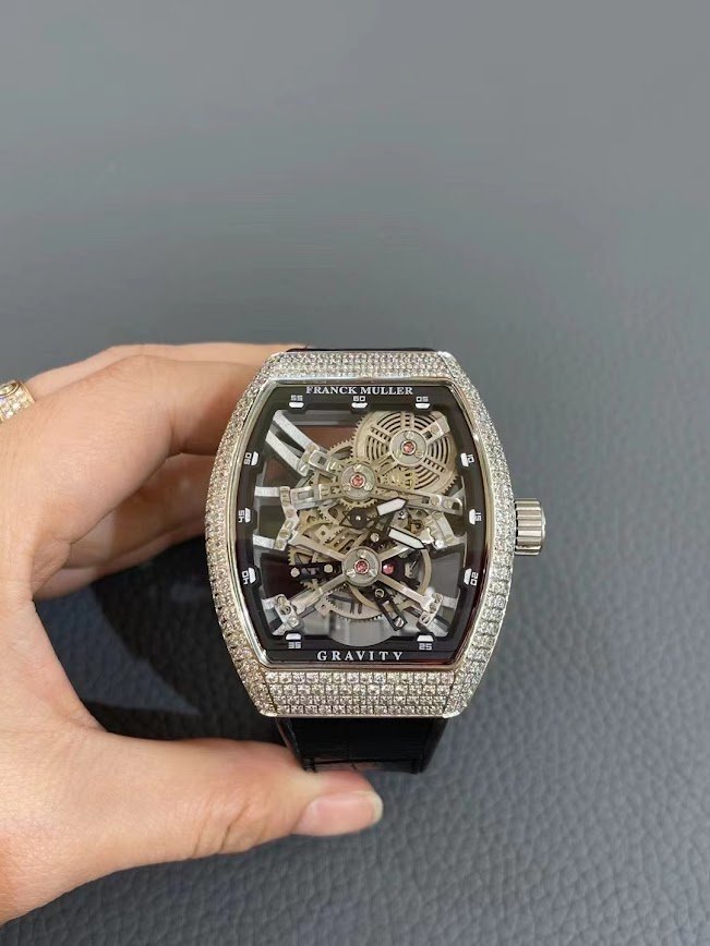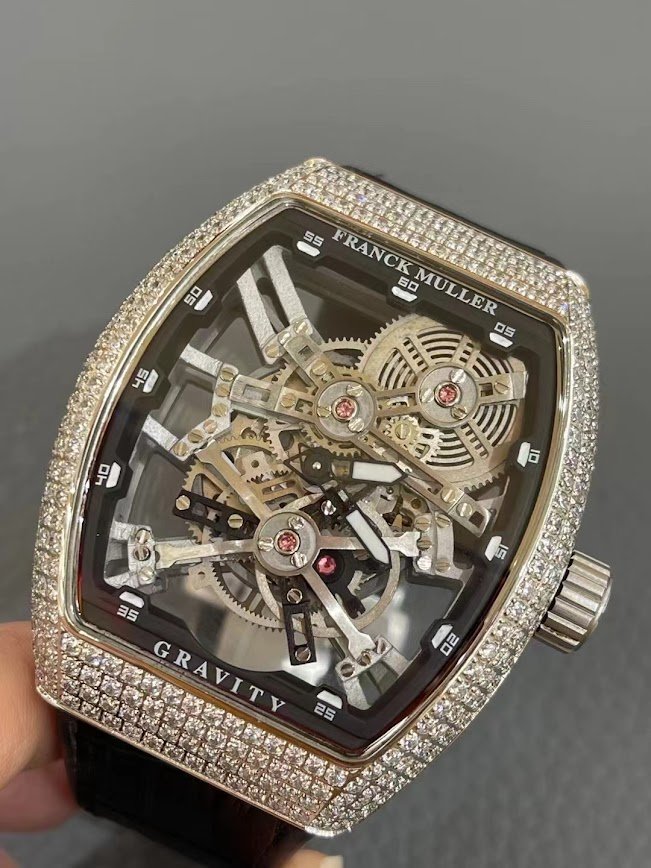 ساعة Franck Muller فاخرة بتصميم Skeleton مميز، بإطار مرصع بالألماس وسوار جلد أسود مع ماكينة سويسرية عالية الدقة.