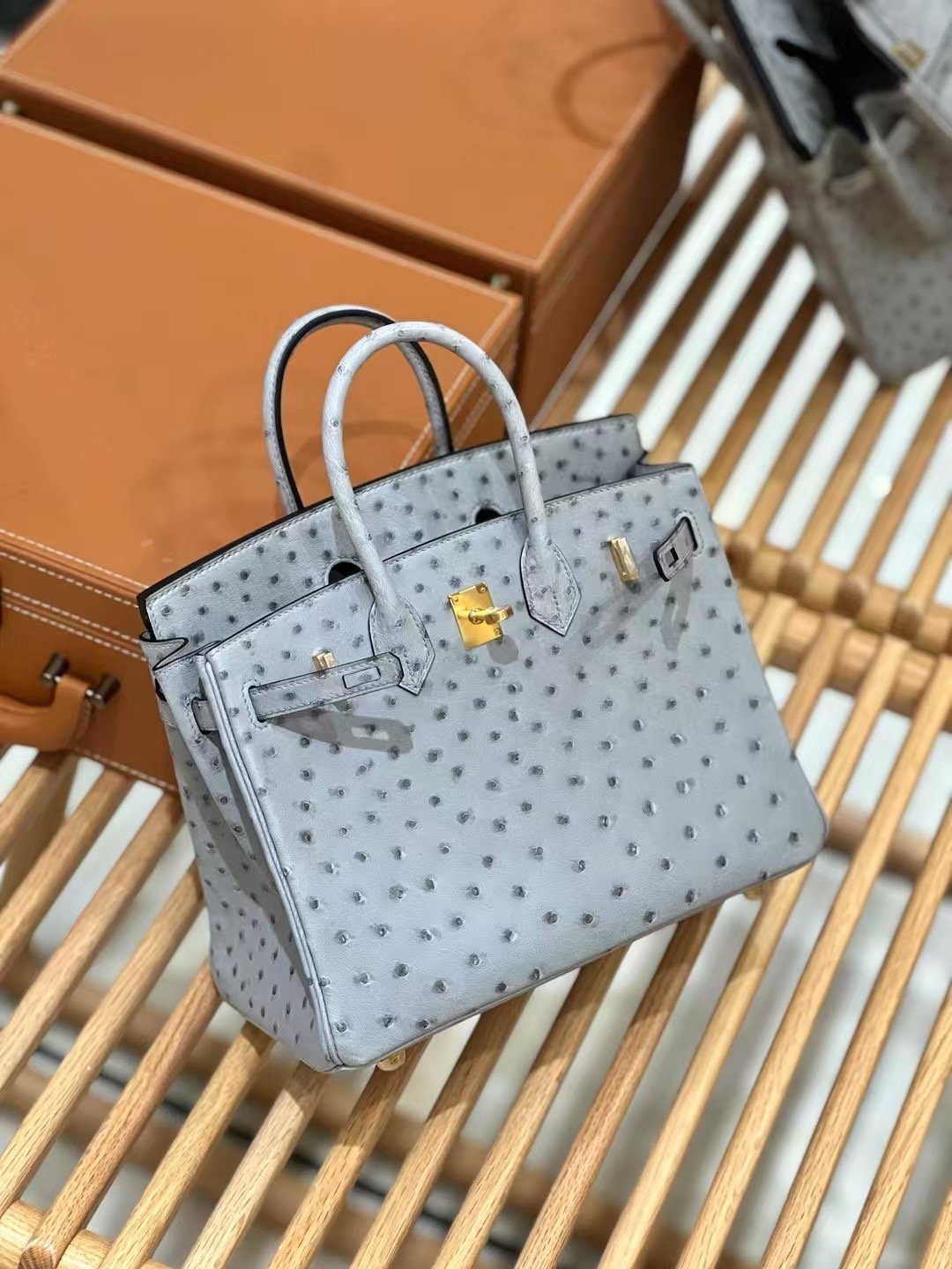 شنطة بيركن مقاس 25 سم بجلد نعامة فاخر، تصميم أنيق وفخم يعطيك إطلالة راقية تناسب كل وقت.