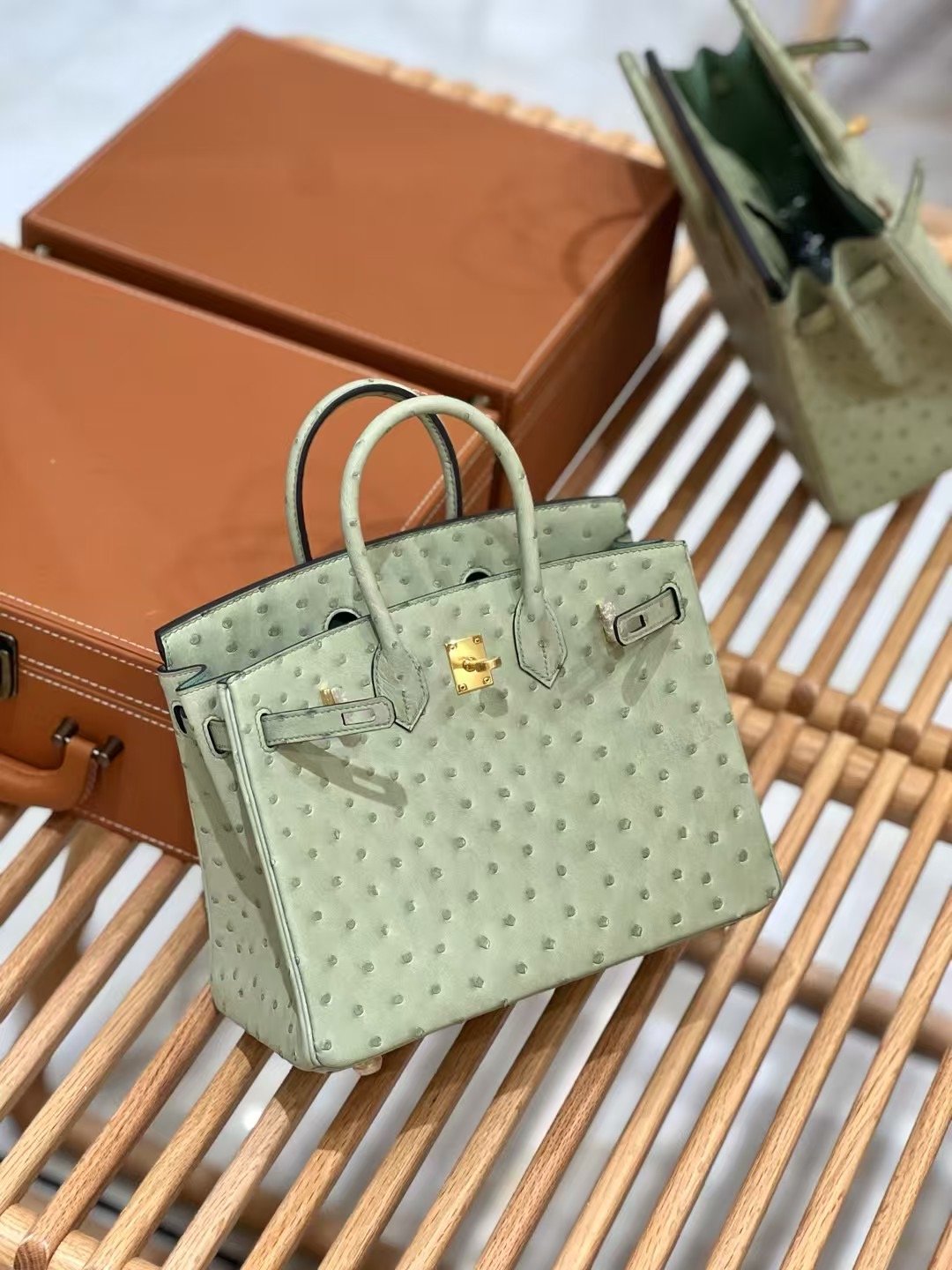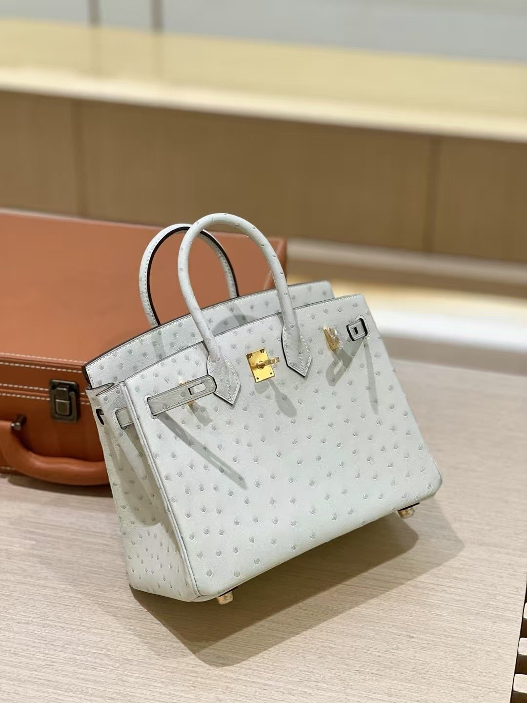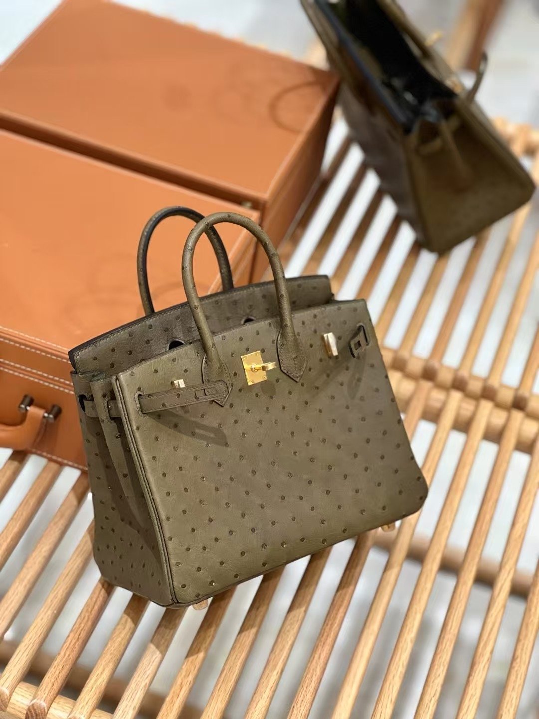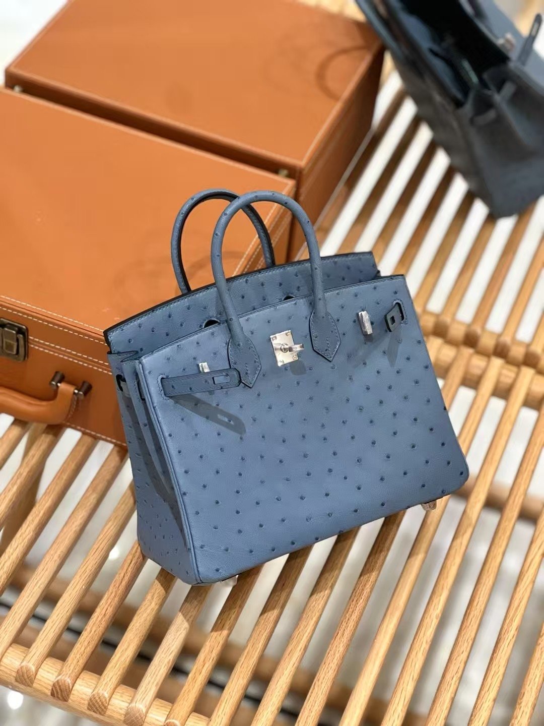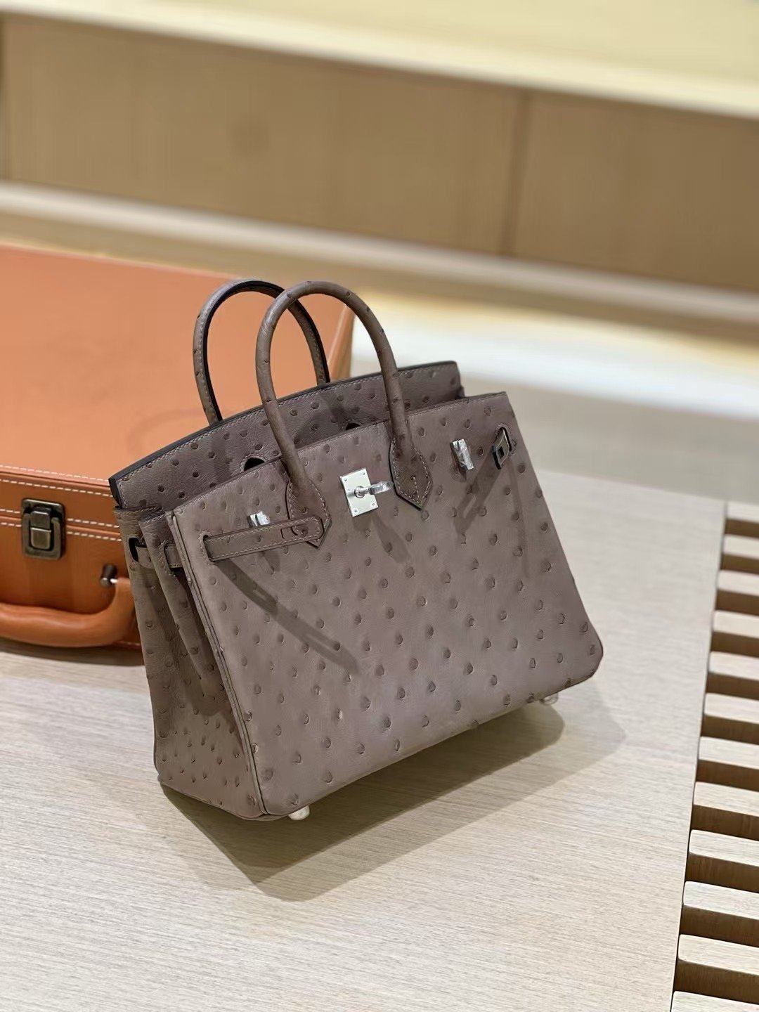 شنطة بيركن جلد نعامة 25 سم – تصميم فاخر بألوان راقية وإغلاق كلاسيك