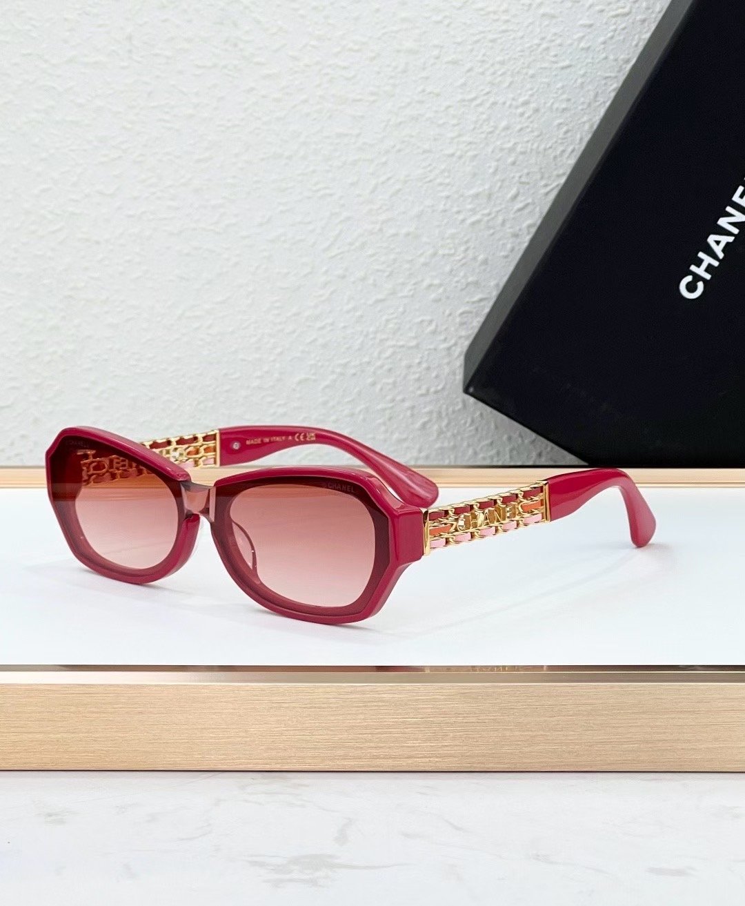 نظارة شمس نسائية من Chanel بإطار ذهبي أنيق وعدسات وردي متدرجة، تعطيك إطلالة فخمة وناعمة تناسب كل وقت.